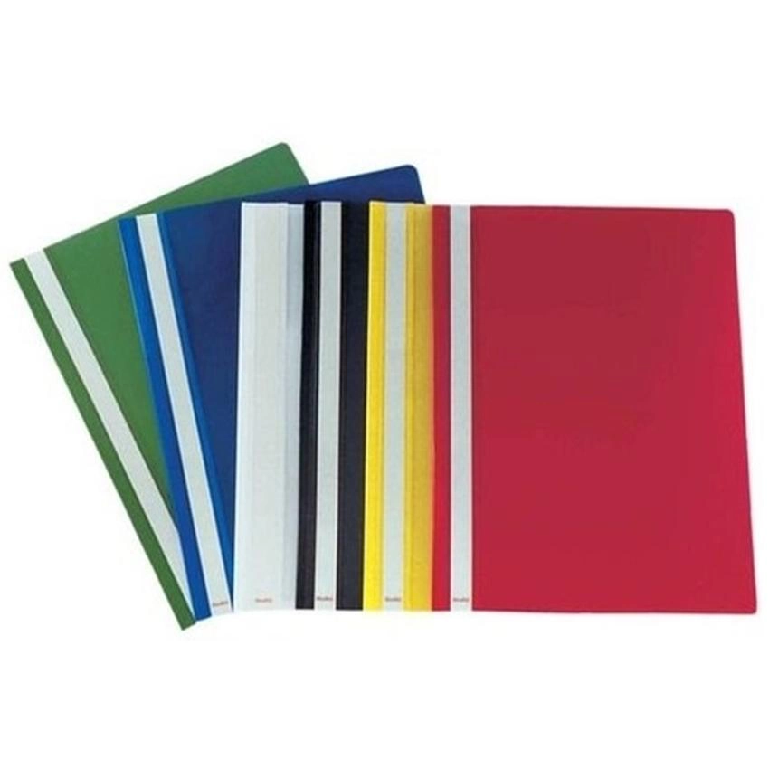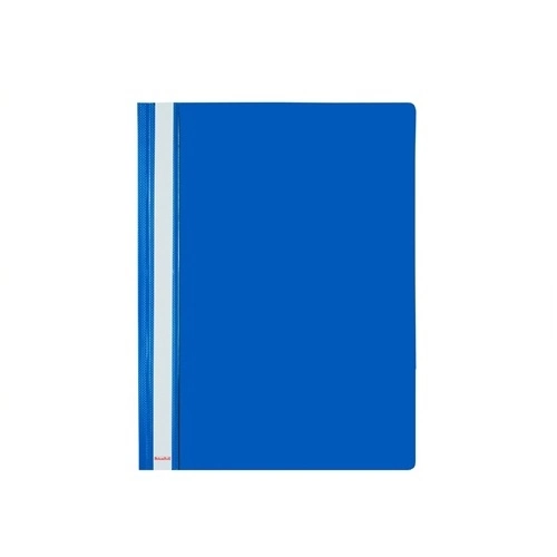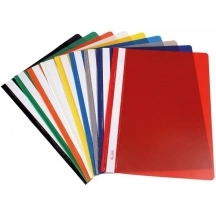 Skoroszyt bez oczek. Przednia okładka przezroczysta twarda, druga kolorowa. Wykonany z mocnego i sztywnego PVC. Wyposażony w papierowy, wysuwany pasek do opisu. Po przeciwnych stronach grzbietu znajdują się dwa wycięcia ułatwiające wysuwanie paska.