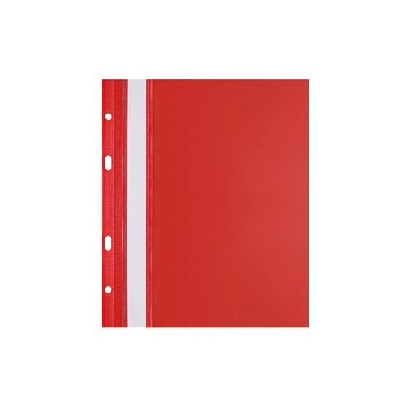 Skoroszyt wykonany z mocnego i sztywnego PCV. Przednia okładka przezroczysta, tylna kolorowa. Obie okładki sztywne. Po przeciwnych stronach grzbietu znajdują się dwa wcięcia ułatwiające wysuwanie paska.