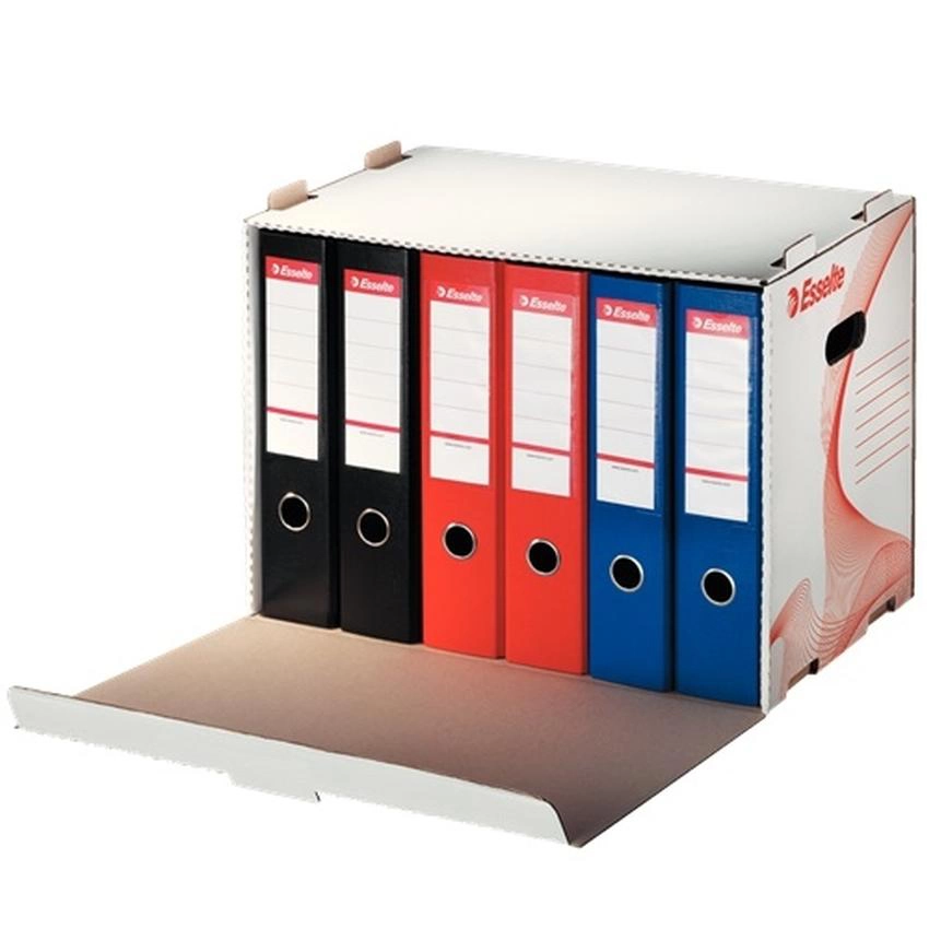 Zintegrowana pokrywa otwierana od przodu zapewnia łatwy dostęp do segregatorów bez konieczności zdejmowania pudła z półki lub z ustawionego stosu. Pudło mieści 6 segregatorów 75 mm lub 6 pudeł na czasopisma 80 mm.