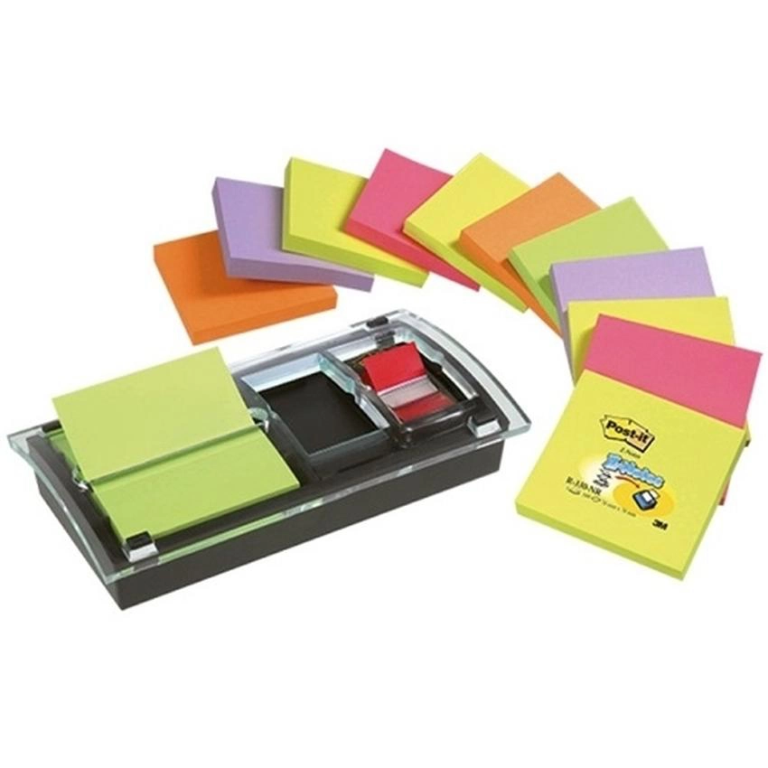 Zestaw promocyjny do bloczków samoprzylepnych Post-It Z-Notes: podajnik Combi-Millenium + 12 bloczków + zakładka.  Doskonały do sporządzania notatek czy zostawiania wiadomości i przypomnień.