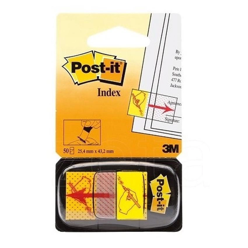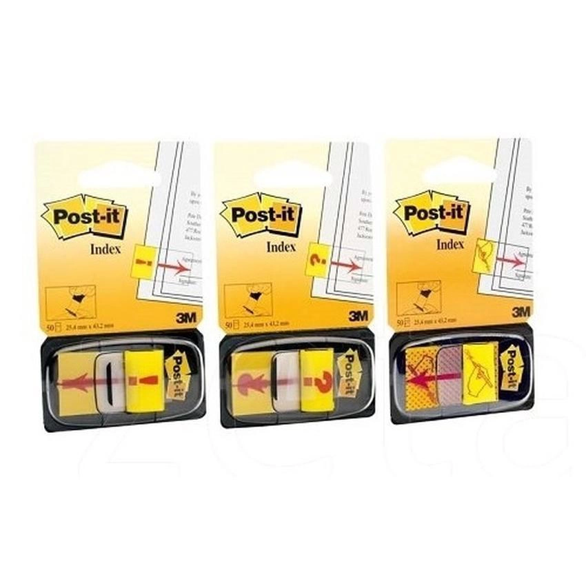 Zakładki indeksujące Post-It z nadrukiem ikony: ręka + ołówek, znak zapytania lub wykrzyknik. Służą do zaznaczania stron, segregowania informacji. Można je wielokrotnie przyklejać i odklejać nie niszcząc dokumentów.