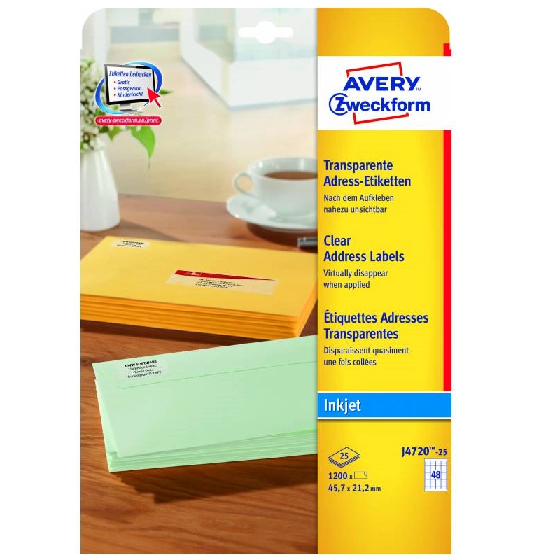 Przezroczyste etykiety do drukarek atramentowych, które znikają po naklejeniu na białą, kolorową lub fakturowaną powierzchnię.