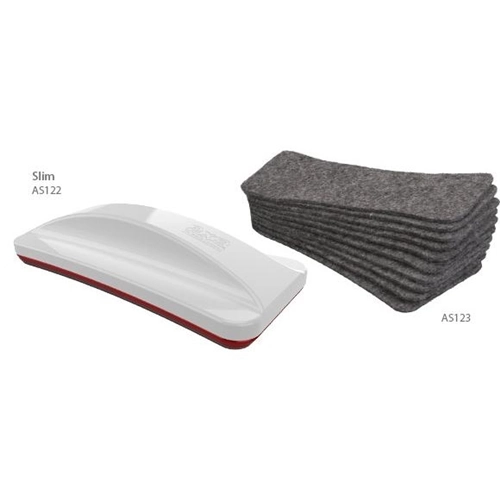 Nowoczesny design, z charakterystycznym czerwonym akcentem. Ergonomiczny, wygodny w użytkowaniu czyścik z wymiennym filcem. Wbudowany magnes pozwala przytwierdzić czyścik w dowolnym miejscu tablicy.