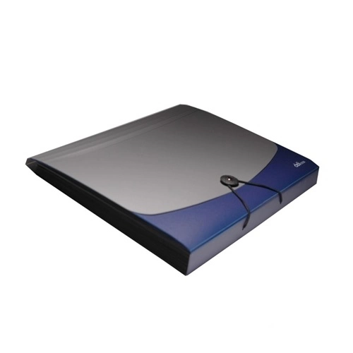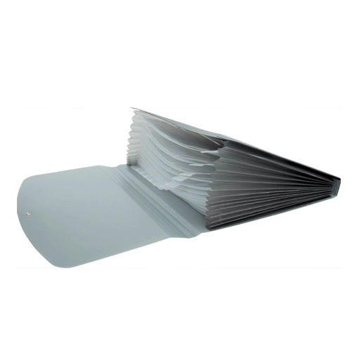 Teczka segregująca na dokumenty w formacie A4. Zamykana na gumkę. Wewnątrz posiada przegródki na dokumenty z wymiennymi etykietami do opisu zawartości. Wykonana z mocnej folii PP.