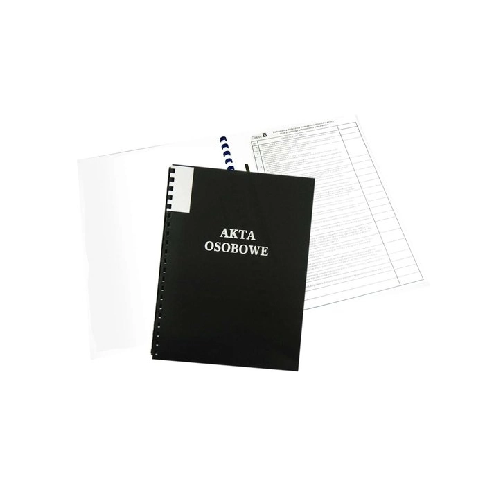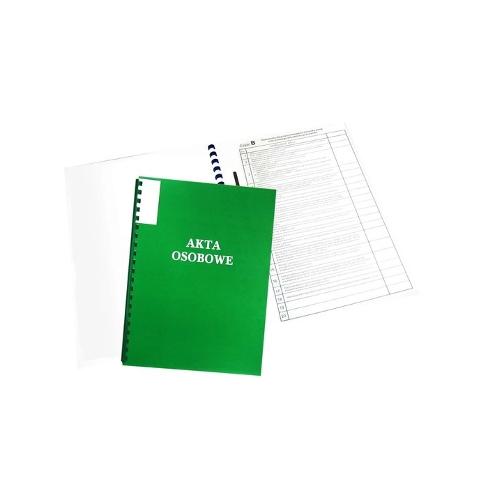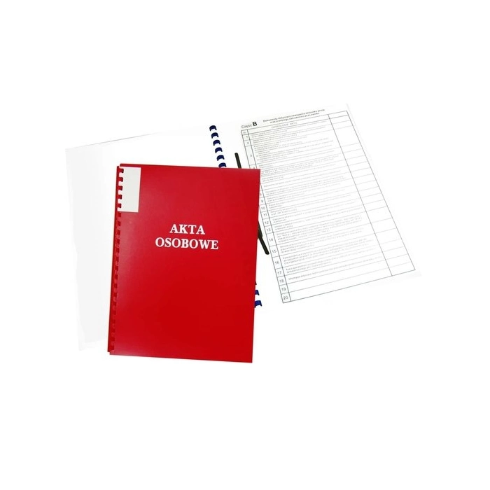 Teczka do akt osobowych z oklejaną okładką typu segregator oraz 2-ringowym mechanizmem. Wyposażona w kartonowe przekładki A, B, C, obustronnie zadrukowane tabelami z treścią, umożliwiającymi opisanie dokumentów.