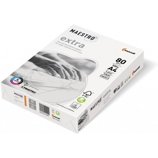Wyprodukowany w rewolucyjnej technologii 3-warstwowej Triotec, do wydruków w drukarkach laserowych atramentowych oraz w kopiarkach wysokonakładowych. Papier Maestro Extra posiada certyfikat FSC. Jest odporny na starzenie - spełnia normę ISO 9706.