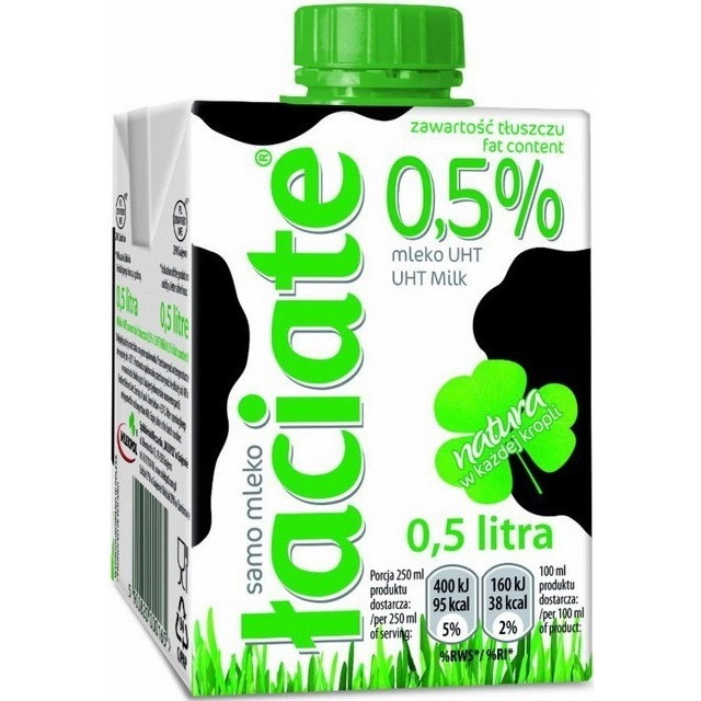 Mleko ŁACIATE poddane zostało procesowi UHT w możliwie najlepszych warunkach, dzięki czemu ma zdecydowanie dłuższy okres przydatności, zachowując wszystkie swoje walory odżywcze nawet przez sześć miesięcy od momentu produkcji. Karton z wygodnym zamknięciem typu r-cap. Mleko w kartonie o pojemności 1l lub 0,5l. Zawartość tłuszczu: 0,5%, 2,0%, 3,2%.