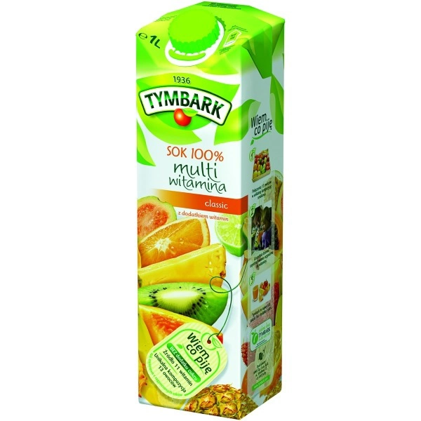 Soki owocowe Tymbark: pomarańczowy 100% z cząstkami miąższu, jabłkowy 100%, z czarnej porzeczki 100% - z zagęszczonych soków owocowych, pasteryzowane, bez dodatku cukru. Sok multiwitamina 11 witamin - wieloowocowo-marchwiowy, zwitaminami i prowitaminą A, częściowo z soków zagęszczonych; pasteryzowany, słodzony. Sok ze świeżych pomidorów, pasteryzowany, przecierowy. Karton 1L