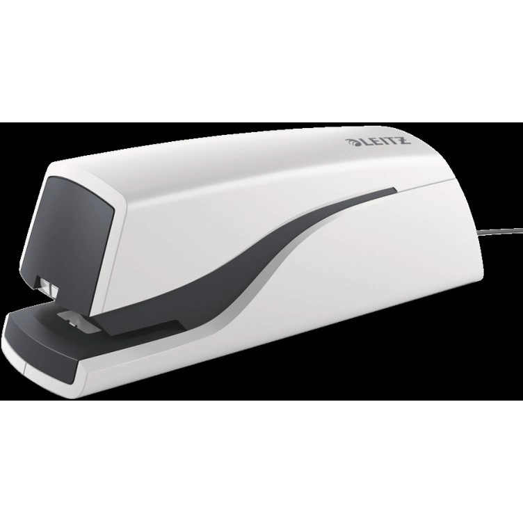 Mały zszywacz elektryczny Leitz Nexxt Series 5532 zasilany z sieci poprzez zasilacz.