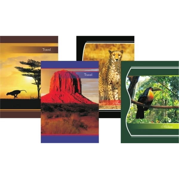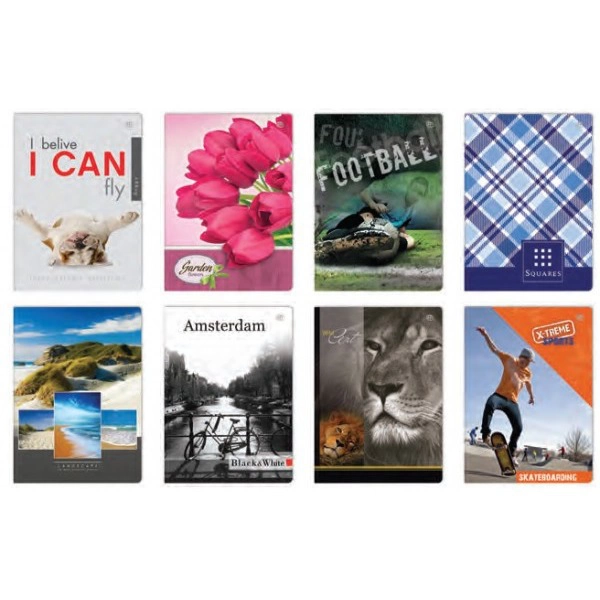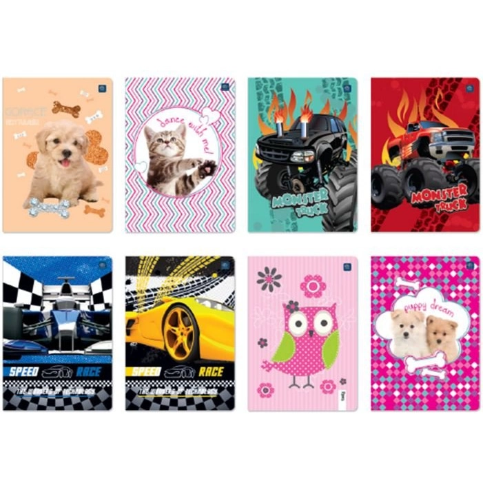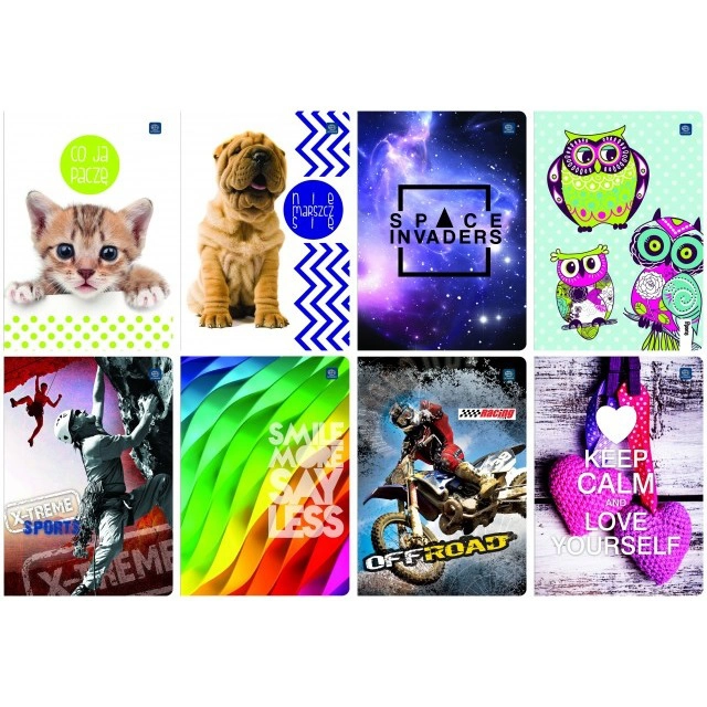 Zeszyty w miękkiej, lakierowanej okładce. Kartki w kratkę, w linie lub gładkie. Zaokrąglone rogi. Duża różnorodność wzorów, dopasowana do grup docelowych.