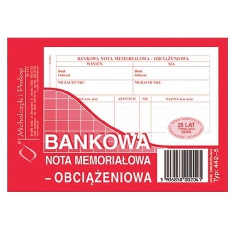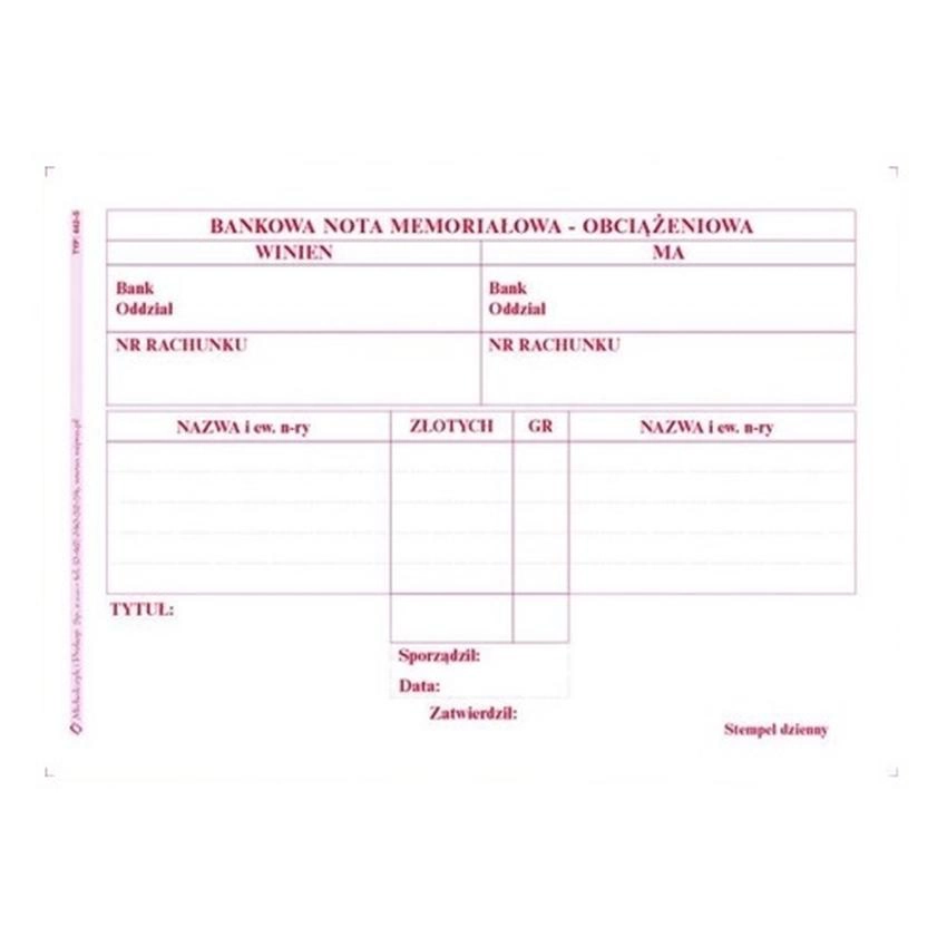 BANKOWA NOTA MEMORIAŁOWA - OBCIĄŻĘNIOWA 442-5 Bankowa nota memoriałowa - obciążeniowa (A6) | indeks: 442-5 | typ: wielokopia