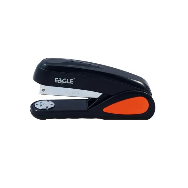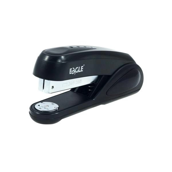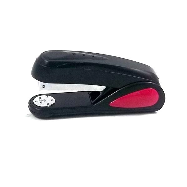 Czarny zszywacz z kolorowymi elementami, metalowa konstrukcja, obudowa z trwałego tworzywa.
