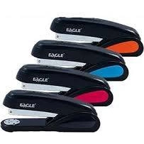 Czarny zszywacz z kolorowymi elementami, metalowa konstrukcja, obudowa z trwałego tworzywa.