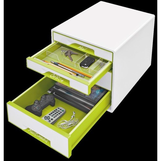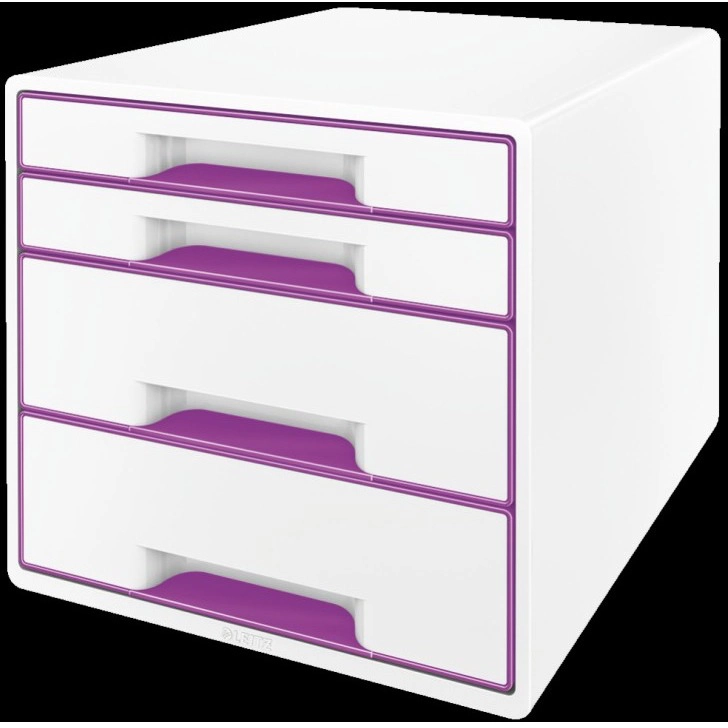 Przykuwające wzrok, najwyższej jakości pojemniki z szufladami WOW z niezwykłym i stylowym połączeniem dwóch kolorów o błyszczącym wykończeniu. Wytrzymały pojemnik z szufladami doskonale pasuje do pozostałych produktów z kolekcji Leitz WOW.