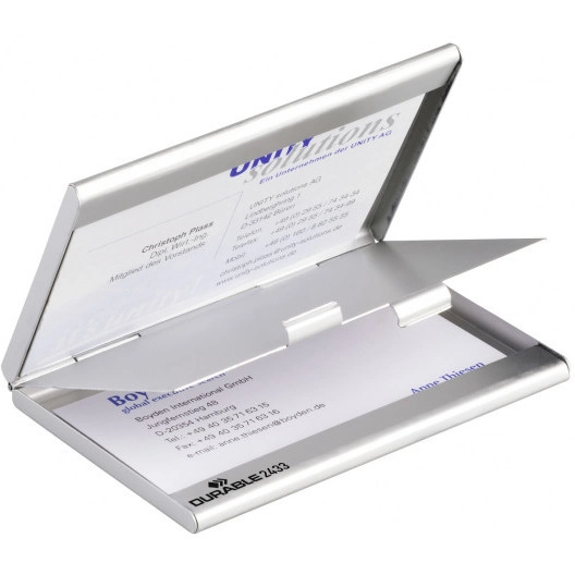 Wysokojakościowe i eleganckie etui na wizytówki z aluminium, powierzchnia zewnętrzna srebrno-matowa.
