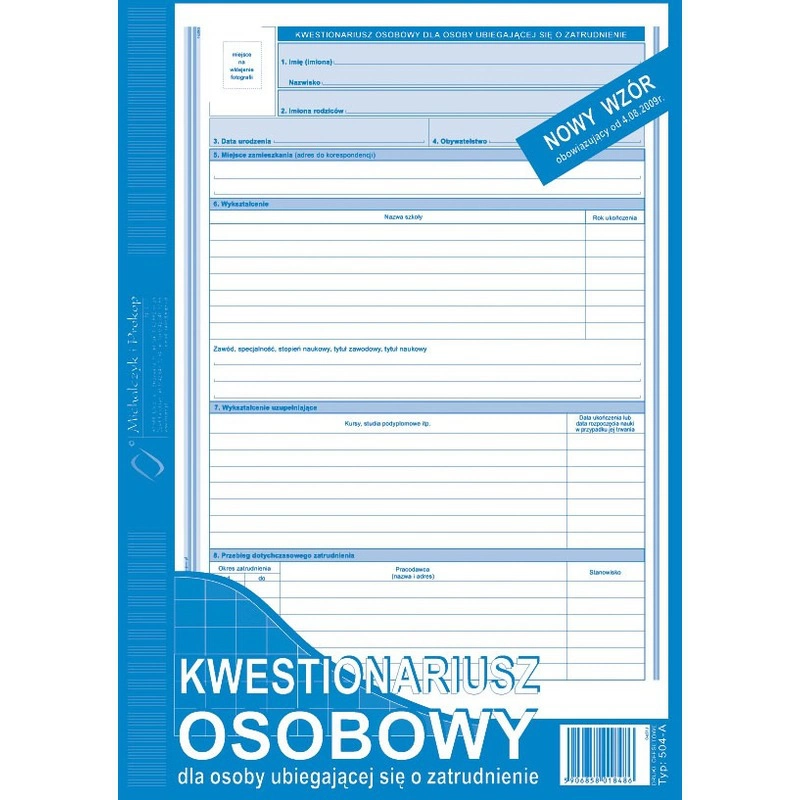 KWESTIONARIUSZ OSOBOWY DLA OSOBY UBIEGAJĄCEJ SIĘ O ZATRUDNIENIE 504-A Kwestionariusz osobowy dla osoby ubiegającej się o zatrudnienie/ indeks: 504-A/ typ: offset / A4