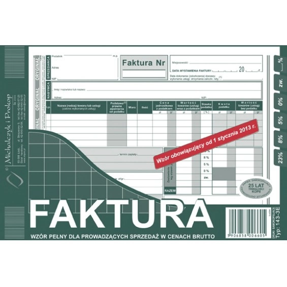 FAKTURA WZÓR PEŁNY DLA PROWADZĄCYCH SPRZEDAŻ W CENACH BRUTTO 143-3E Faktura wzór pełny dla prowadzących sprzedaż w cenach brutto (A5) indeks: 143-3E | typ: oryginał + kopia