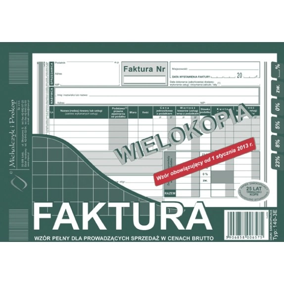 FAKTURA WZÓR PEŁNY DLA PROWADZĄCYCH SPRZEDAŻ W CENACH BRUTTO 140-3E Faktura wzór pełny dla prowadzących sprzedaż w cenach brutto, wielokopia / 140-3E / A5