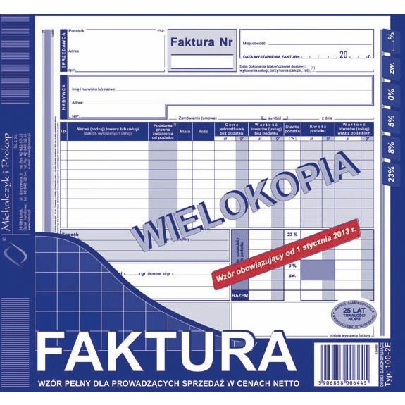 FAKTURA WZÓR PEŁNY DLA PROWADZĄCYCH SPRZEDAŻ W CENACH NETTO 100-2E Faktura wzór pełny dla prowadzących sprzedaż w cenach netto (2/3 A4) indeks: 100-2E | typ: wielokopia