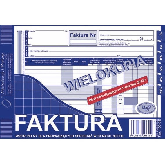 FAKTURA WZÓR PEŁNY DLA PROWADZĄCYCH SPRZEDAŻ W CENACH NETTO 100-3E Faktura wzór pełny dla prowadzących sprzedaż w cenach netto (A5) indeks: 100-3E | typ: wielokopia