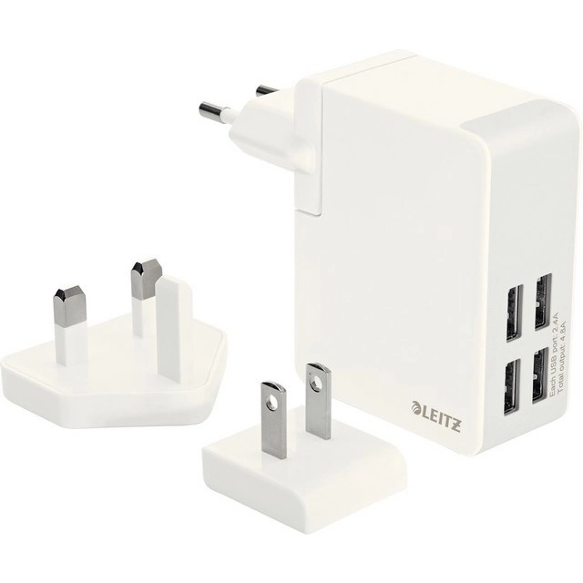 ŁADOWARKA ŚCIENNA LEITZ COMPLETE TRAVELLER Z 4 PORTAMI USB biała, moc 24 w, wtyczki do gniazdek ue, uk i usa