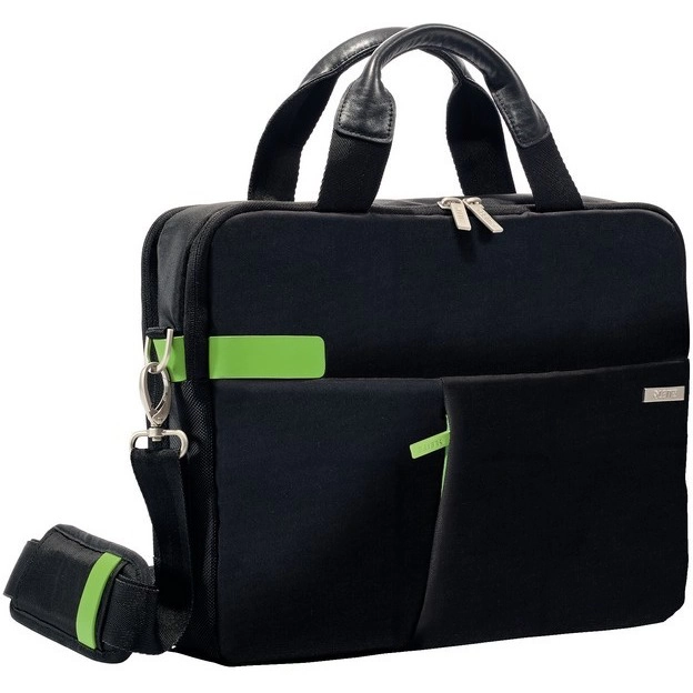 Wysokiej jakości lekka torba z dwiema przegródkami i kieszenią z przodu. Wyróżniające się, efektowne wzornictwo, z wygodnym zamkiem błyskawicznym i eleganckimi metalowymi zapięciami. Z zewnątrz jest czarna, wewnątrz wyróżnia się zielonym kolorem, który pozwala na łatwe odnajdywanie przedmiotów. Miejsce na urządzenia mobilne, laptop 13,3" i dokumenty A4. Posiada usztywnione skórzane rączki, regulowany pas na ramię oraz uchwyt mocujący do wózków lotniskowych.