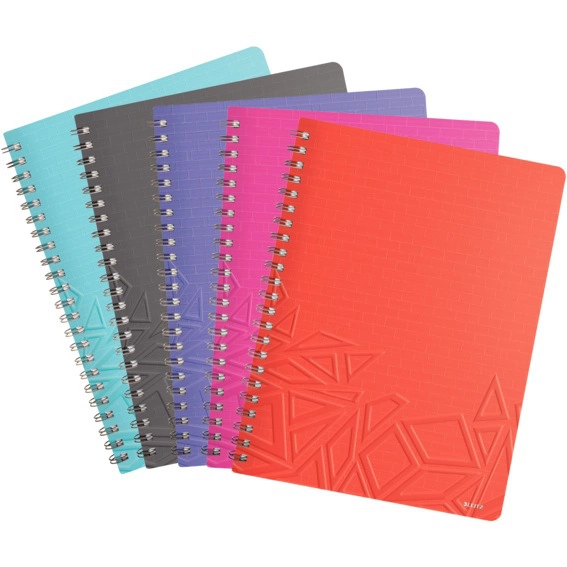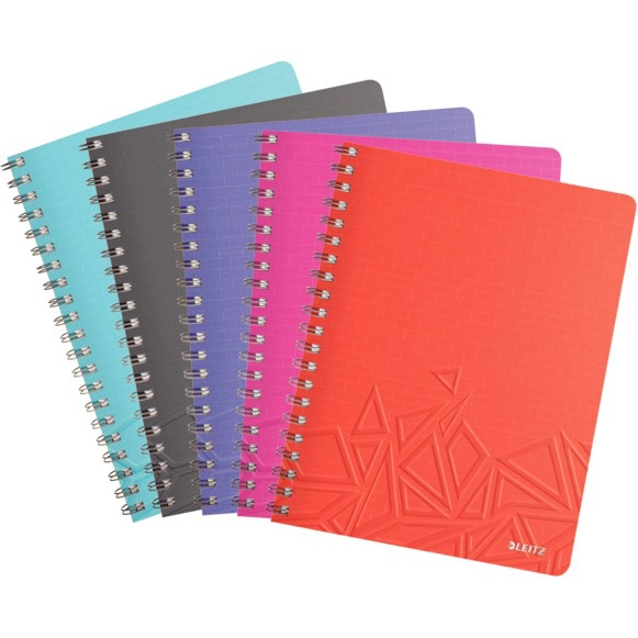 Notatnik Leitz z lekką, ale bardzo wytrzymałą, giętką okładką z laminowanego kartonu. Oprawa w spiralę umożliwia pełne (360°) otwarcie notatnika, a także zawinięcie kartek pod spód i używanie notatnika jako podkładki do robienia notatek.