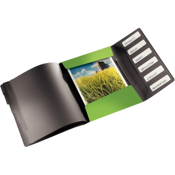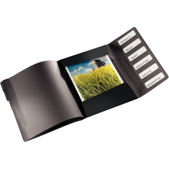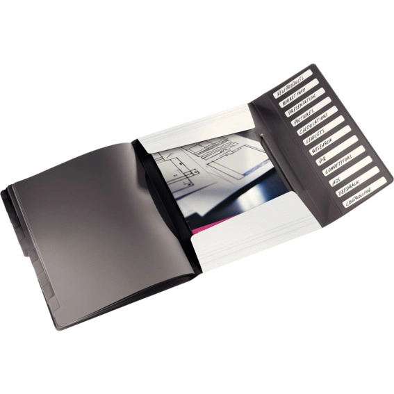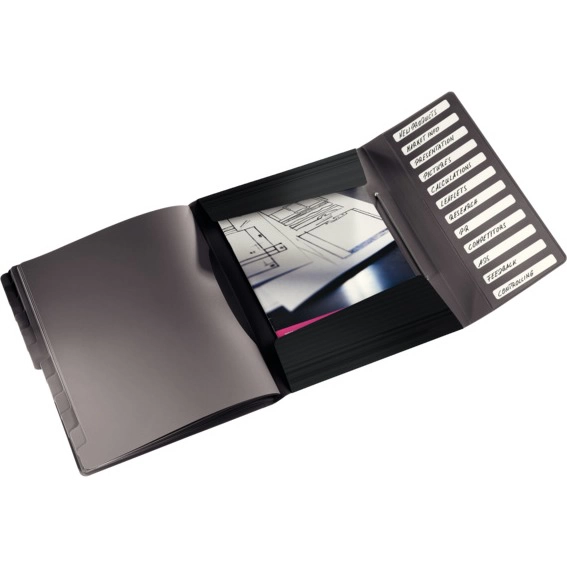 Ozdobne zamknięcie na gumkę zabezpiecza dokumenty podczas przenoszenia. Łatwe sortowanie dzięki 6 lub 12 przekładkom z indeksami. Trzy dodatkowe klapki wewnątrz tylnej okładki do przechowywania luźnych dokumentów.