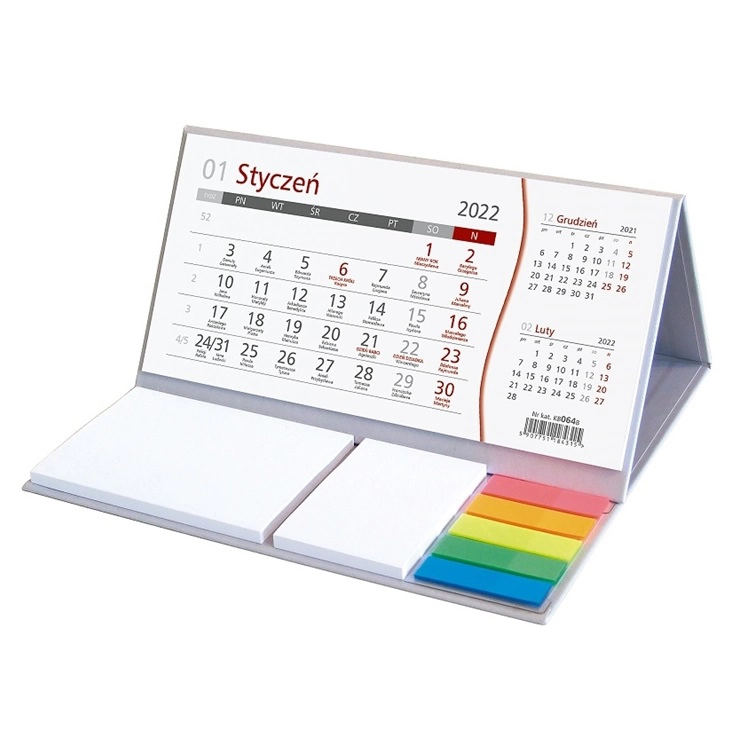 Wygodny kalendarz stojący na biurko z przejrzystym kalendarium w układzie trzymiesięcznym z poręcznymi karteczkami samoprzylepnymi do notowania. Przydatny zwłaszcza w biurze. W kalendarzu zaznaczono święta i daty imienin.