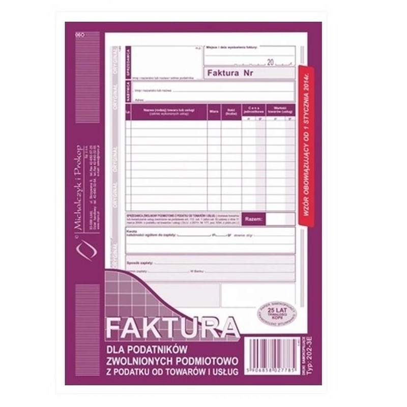 FAKTURA DLA PODATNIKÓW ZWOLNIONYCH PODMIOTOWO Z PODATKU OD TOWARÓW I USŁUG 202-3E (A5), indeks: 202-3E, typ: oryginał + kopia