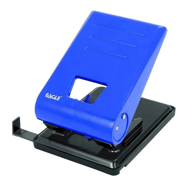 Dziurkacz posiada plastikowe, wytrzymałe ramię oraz metalową podstawę i wykończenia z tworzyw sztucznych.