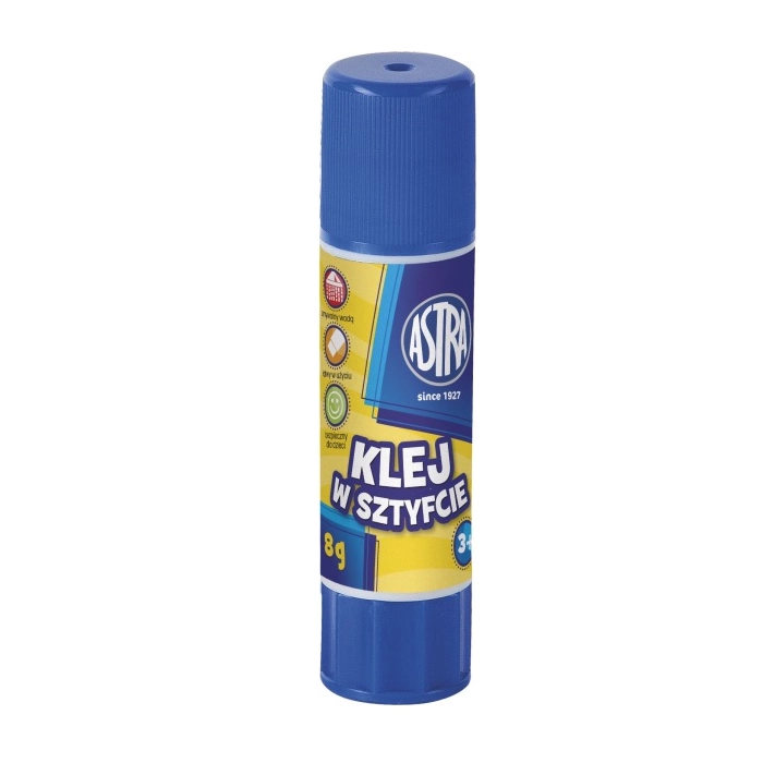 Klej w sztyfcie ASTRA nadaje się do papieru i cienkiej tektury. Nie zawiera rozpuszczalników. Jest łatwo zmywalny i nie pozostawia zabrudzeń. Klej posiada długi okres przydatności.