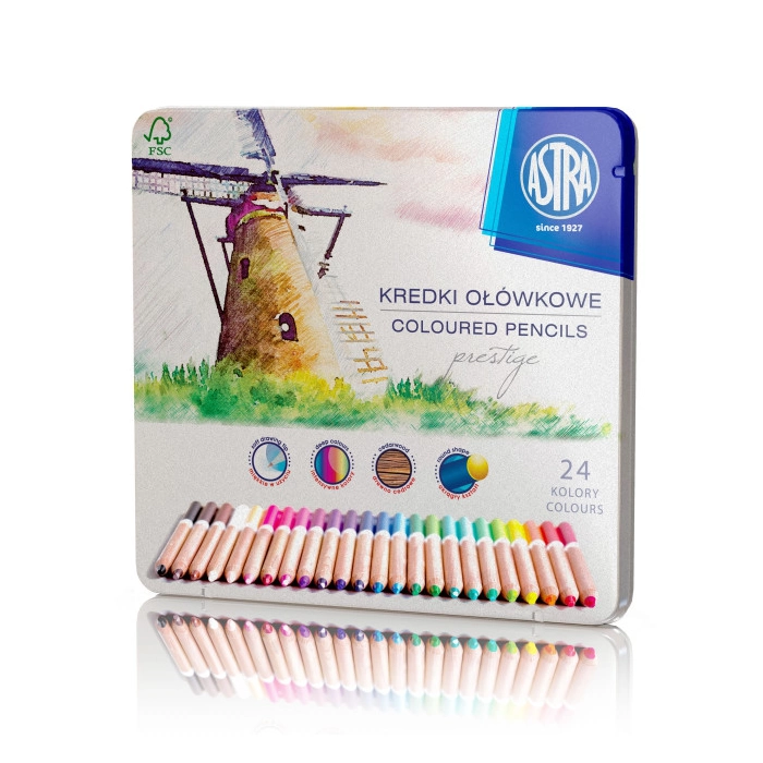 KREDKI OŁÓWKOWE PRESTIGE ASTRA 24 kolory drzewo cedrowe, metalowe opakowanie