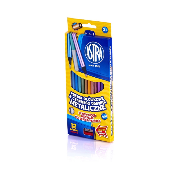 KREDKI OŁÓWKOWE METALICZNE Z CZARNEGO DREWNA ASTRA 12 kolorów