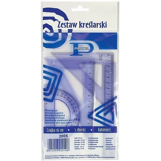 • zestaw kreślarski 2005 PR: standardowa przezroczysta ekierka 16 cm 45/60 stopni kątomierz 10 cm/180 stopni linijka 16 cm lub 20 cm