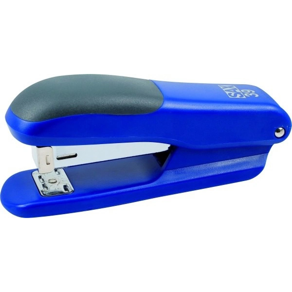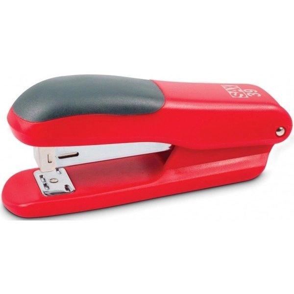 Zszywacz biurowy wyposażony w metalowy mechanizm, plastikowe ramię oraz podstawę o wysokiej wytrzymałości.