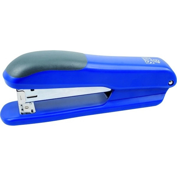 Zszywacz biurowy wyposażony w metalowy mechanizm, plastikowe ramię oraz podstawę o wysokiej wytrzymałości.