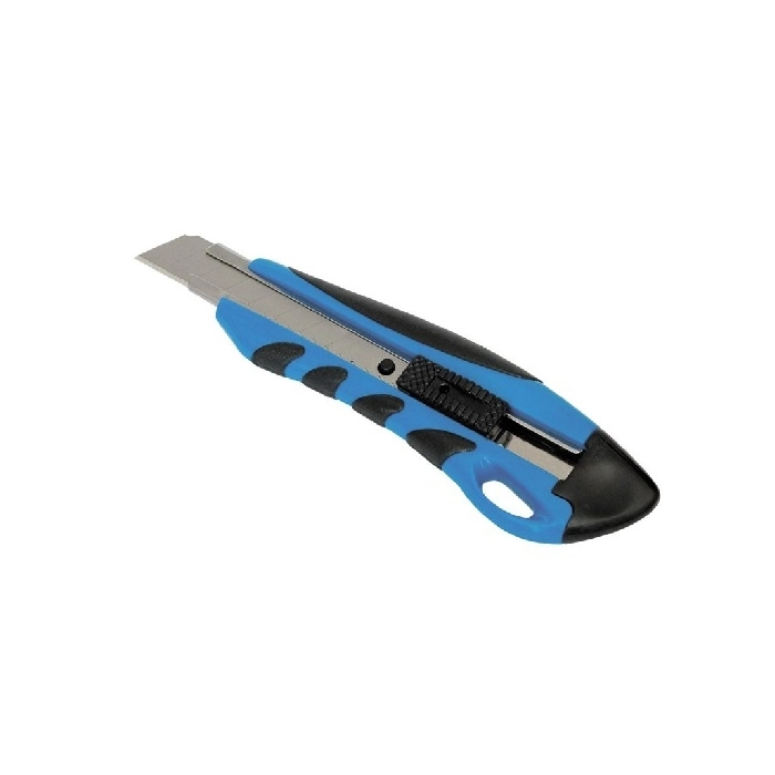 Plastikowy, z gumowymi elementami, z wysuwanym, specjalnie wzmocnionym ostrzem. Dodatkowe metalowe wzmocnienie rękojeści pozwala ciąć twarde powierzchnie.