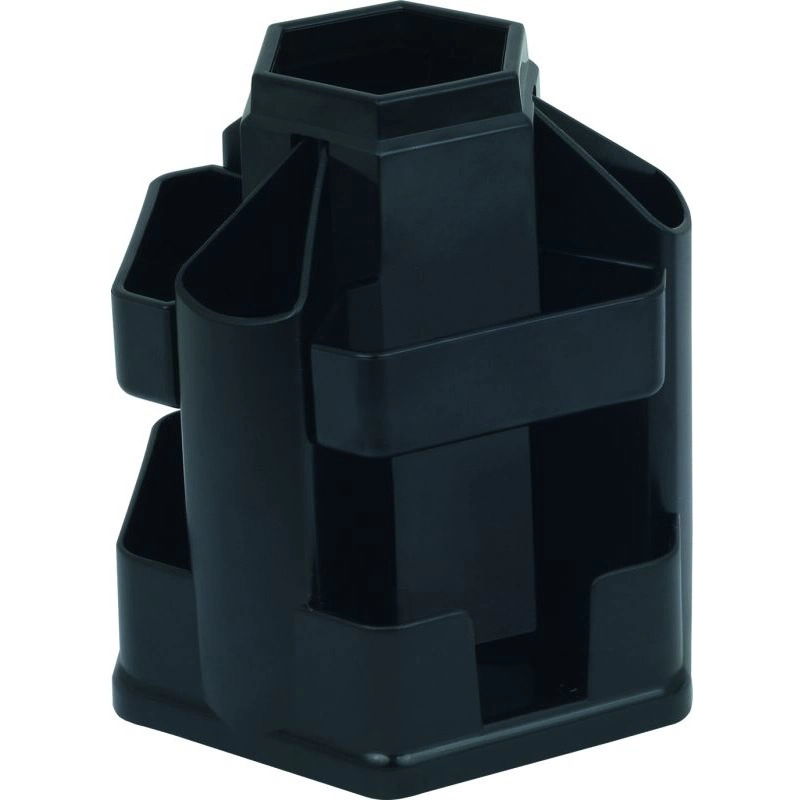 Przybornik na biurko, obrotowy, wykonany z trwałego tworzywa w kolorze czarnym. Łatwy i wygodny dostęp do szukanego przedmiotu dzięki funkcji obrotowej.